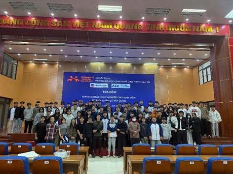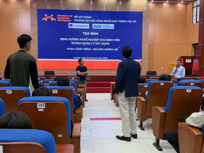 Thực hiện nhiệm vụ đào tạo gắn liền với thực hành và định hướng nghề nghiệp theo thực tiễn năm học 2025–2026 của Trường Đại học Công nghệ GTVT, Bộ môn Đường bộ – Khoa Công trình phối hợp cùng các đơn vị xây dựng uy tín gồm Công ty Freyssinet Việt Nam, Tổng công ty Cảng hàng không Việt Nam (ACV) và Tổng công ty Xây dựng Vinaconex đã tổ chức chương trình “Tọa đàm định hướng nghề nghiệp và tham quan trải nghiệm thực tế” dành cho sinh viên khóa 76 ngành Quản lý Xây dựng, nhằm giúp sinh viên có cái nhìn toàn diện về nghề nghiệp tương lai và sự phát triển của ngành trong bối cảnh mới.
