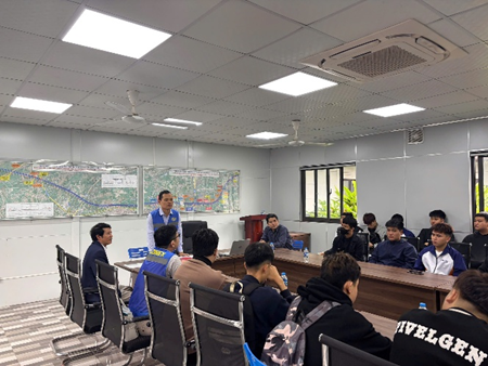 Tiếp nối chương trình tọa đàm, ngày 08/11/2025, sinh viên K76 ngành Quản lý Xây dựng đã tham gia chuyến tham quan và trải nghiệm thực tế tại các công trình trọng điểm như tuyến đường song hành Vành đai 4 – đoạn Hà Nội và Ban Quản lý Dự án Đường Vành đai 4. Tại công trường Dự án Vành đai 4 do Tổng công ty Vinaconex làm tổng thầu, sinh viên được trực tiếp nghe giới thiệu tổng quan dự án, tìm hiểu quy trình triển khai, giám sát và quản lý thi công. Các bạn cũng có cơ hội trao đổi với các kỹ sư và cán bộ điều hành công trường như ông Vũ Văn Hưng – Phó Giám đốc Ban điều hành dự án, ông Trần Quốc Đức – cán bộ kỹ thuật và ông Nguyễn Lương Thoại – cán bộ quản lý chất lượng. Những chia sẻ chân thực về thuận lợi, khó khăn và cơ hội phát triển nghề nghiệp trong ngành đã giúp sinh viên có thêm góc nhìn thực tế, định hình rõ hơn con đường nghề nghiệp trong tương lai.